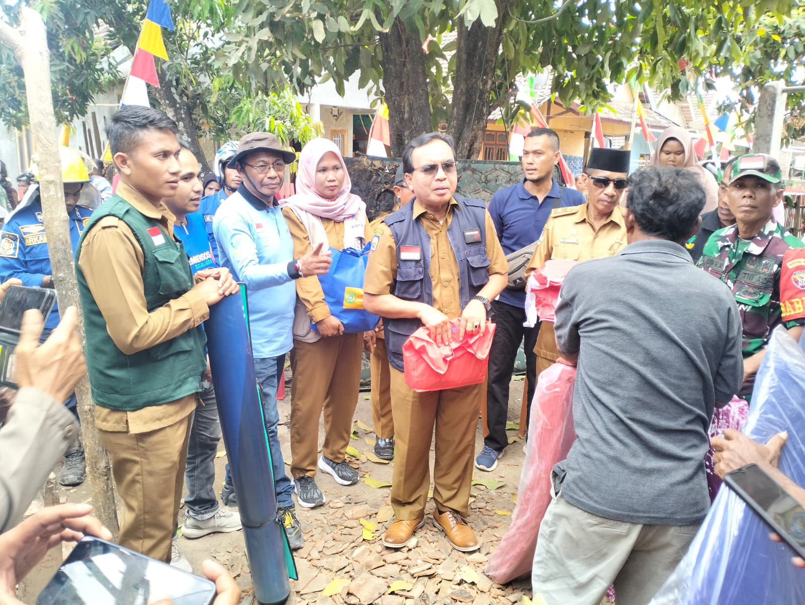Pada kesempatan ini turut hadir juga Kepala Dinas Sosial Tajuddin SH., M.SI bersama Kabid Linjamsos Edy Syahroni, AKS menyerahkan bantuan berupa logistik dan tenda portabel atau tenda darurat.