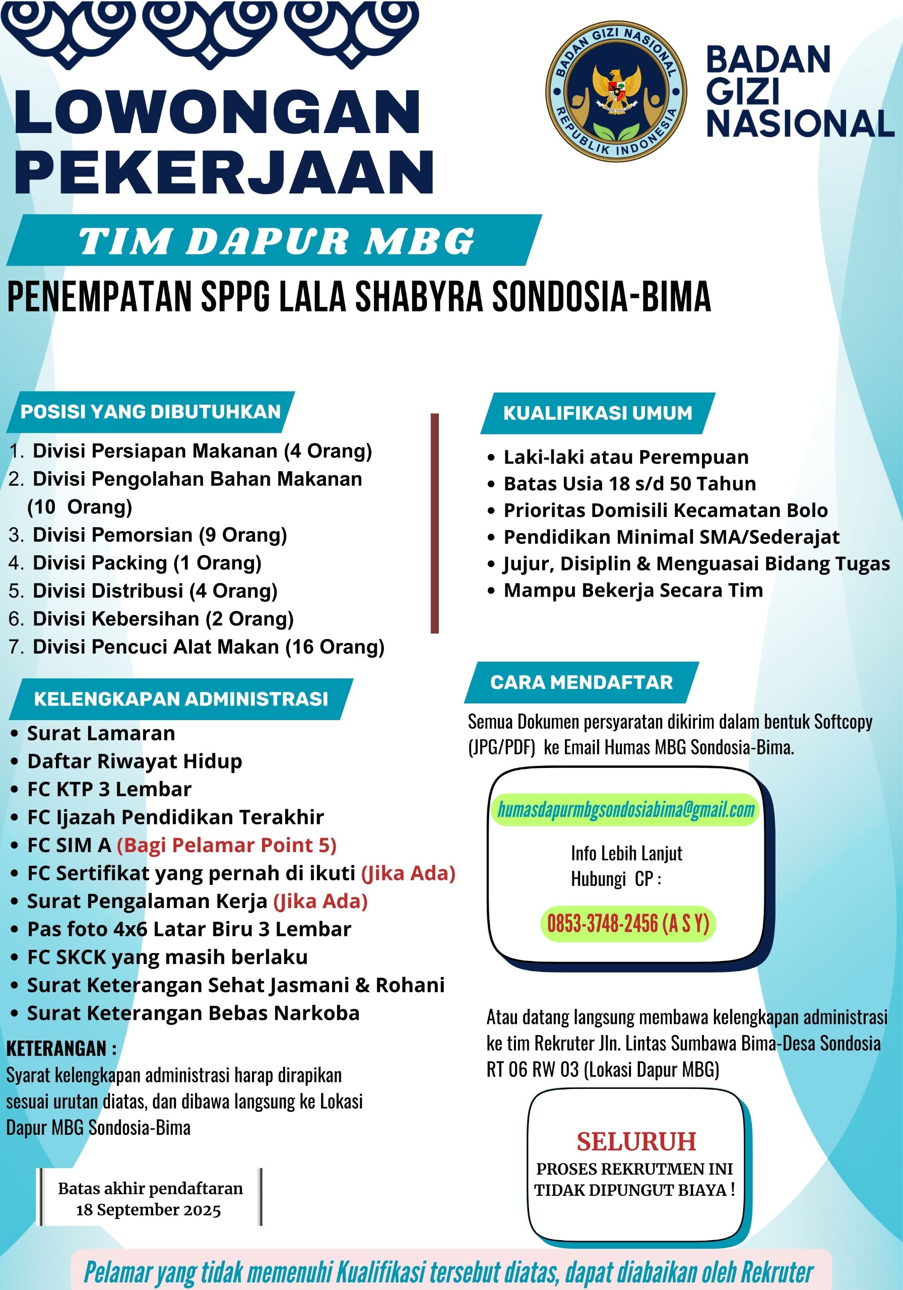 Untuk mendukung jalannya program tersebut SPPG membuka Rekrutmen pegawai mulai tanggal 13 September- 18 September 2025, bagi masyarakat yang berminat silakan mendaftarkan diri,” terangnya.