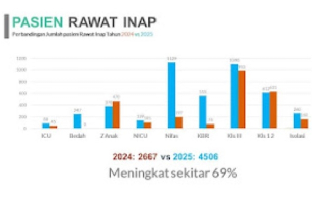 Salah satu indikator paling menonjol terlihat pada layanan rawat inap. Dibandingkan tahun 2024, jumlah pasien rawat inap pada tahun 2025 melonjak 69 persen, dari 2.667 pasien menjadi 4.506 pasien. Demikian juga layanan IGD dan rawat jalan, juga meningkat signifikan. Angka ini mencerminkan meningkatnya akses dan kepercayaan masyarakat terhadap layanan rumah sakit.