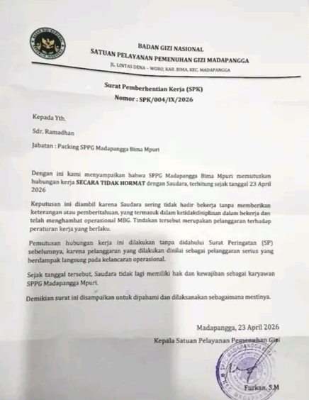 BIMA, Kabaroposisi, Id__Seorang pekerja bagian packing MBG bernama Ramadhan dilaporkan mengalami pemutusan hubungan kerja (PHK) secara sepihak oleh Kepala Dapur SPPG Madapangga Bima, Mpuri. Keputusan tersebut menuai sorotan karena dinilai tidak melalui prosedur yang layak serta tidak mencerminkan prinsip kemanusiaan.